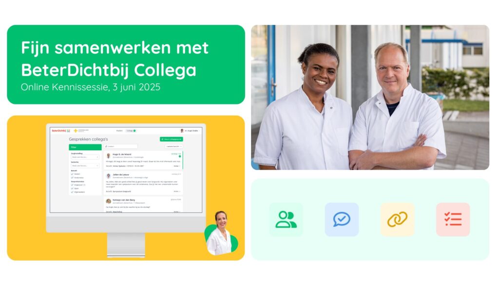 • Inzicht in hoe BeterDichtbij Collega bijdraagt aan veilige, eenvoudige communicatie tussen zorgprofessionals
