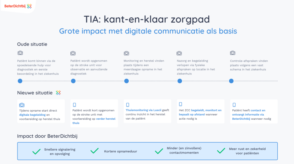 Zuyderland heeft het zorgpad voor patiënten met een TIA (transient ischemic attack) herontworpen met digitale zorg als uitgangspunt. Door BeterDichtbij in te zetten als centrale communicatietool en monitoring op afstand via Luscii toe te voegen, verschuift de zorg steeds meer van het ziekenhuis naar de thuissituatie.