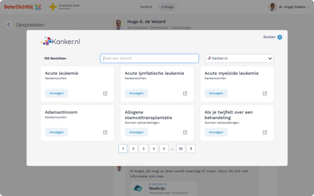 De informatie van kanker.nl is voor alle zorgverleners die betrokken zijn bij oncologietrajecten beschikbaar. Zij bepalen zelf welke informatie ze delen met hun patiënten. Het is direct beschikbaar via de contentbibliotheek, net als de informatie van Thuisarts.nl en van Indiveo (als jouw organisatie klant is).